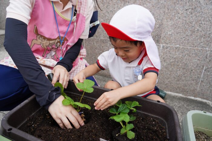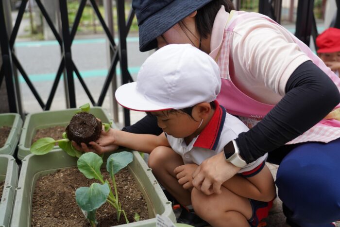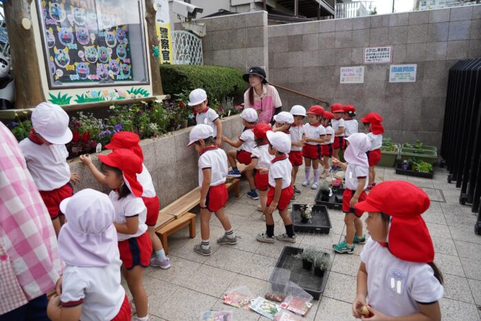 例年は冬に向けて咲くパンジーやビオラなどを中心に植えているのですが、今年は夏の暑さの影響もあり、冬まで咲くお花が少なくなってしまいました。そこで今年は、コスモス桔梗など、秋に咲くお花をメインに選びました。桔梗は秋の七草のひとつ。風に揺れる姿がとても美しく、季節の訪れを感じさせてくれます。たくさんのお花や野菜の中から子どもたちが「これを植えたい!」というものを選び、それぞれが植える場所を考えて、丁寧に植えていきました。また、春に向けてたくさんの球根も植えました。